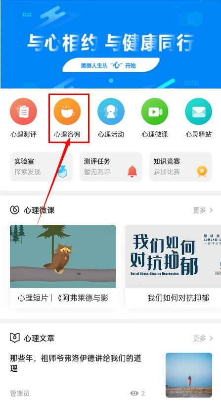 1、通过“8858cc永利唯一官方网心理中心”微信公众号进行预约登记。点击“心理咨询”;