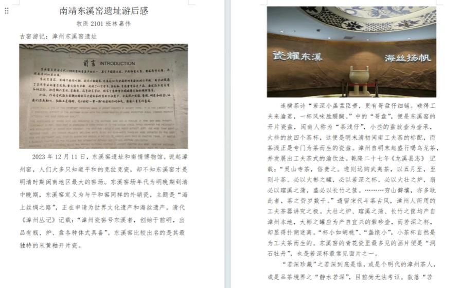 寒假期间,同学们围绕平潭壳丘头遗址群、漳州南靖东溪窑遗址、昙石山遗址,南岛语族文化、朱子文化、等开展福建优秀地域文化文明探源行动,探寻文化谱系。通过实地走访,同学们深切感受到福建优秀地域在时空斗转星移中发生的自然轮换现象,真正从内心领略各类遗址、历史文化街区中所蕴含的丰厚文化底蕴以及较高的历史人文价值。