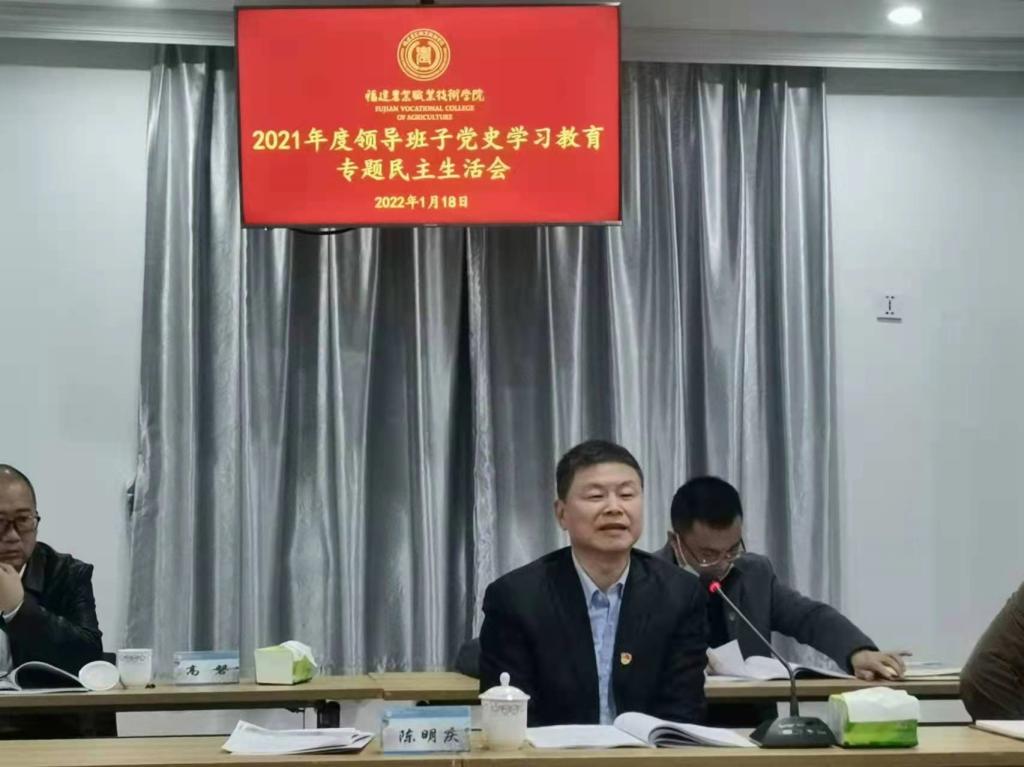 1月18日下午,2021年度校领导班子党史学习教育专题民主生活会在首山校区办公楼502教室召开。省委教育工委、省教育厅一级巡视员陈明庆,省教育系统党史学习教育第四巡回指导组组长、闽江学院纪委原书记詹林,省教育厅教师工作处处长戴颖,省纪委监委驻省教育厅纪检监察组副组长汪建军,指导组副组长、福建农林大学正处级干部叶青,以及指导组高磐、陈润华、李玲玉、林木子等同志到会指导。8858cc永利唯一官方网党委领导班子成员参加会议,党政办公室、组织部、宣传统战部、纪委办公室负责人列席会议。会议由院党委书记杨振坦主持。