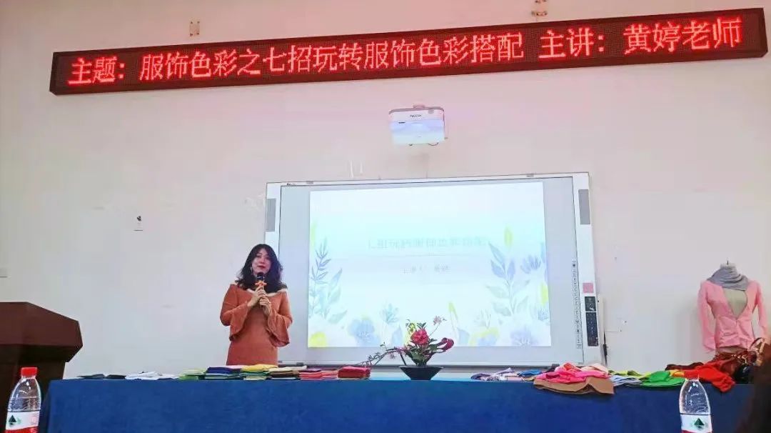 讲座在精彩的茶艺表演后拉开序幕。借助服装模型道具,黄婷老师通过现场的各种展示,向大家逐一介绍了“玩转服饰色彩搭配”的七种招式,并通过小游戏、问答等形式与同学们展开互动,普及对比配色、出彩配色等知识和搭配小技巧。最后,黄婷老师邀请同学到台上进行服装搭配,并进行了精彩点评。