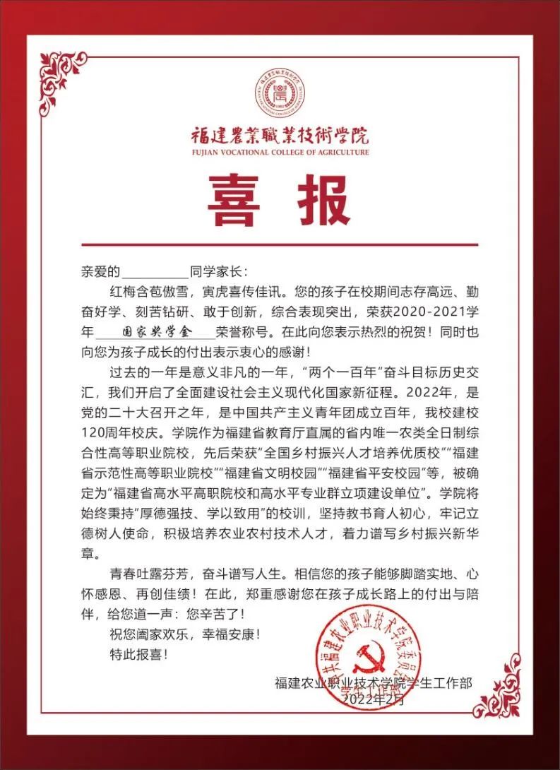 今年喜报的寄发范围为2020-2021学年国家奖学金、国家励志奖学金、学院综合奖学金、三好学生、优秀学生干部、优秀共青团干部、优秀共青团员的获得者;共计2125名学生,2125份喜报,已于3月中旬全部寄送完成。