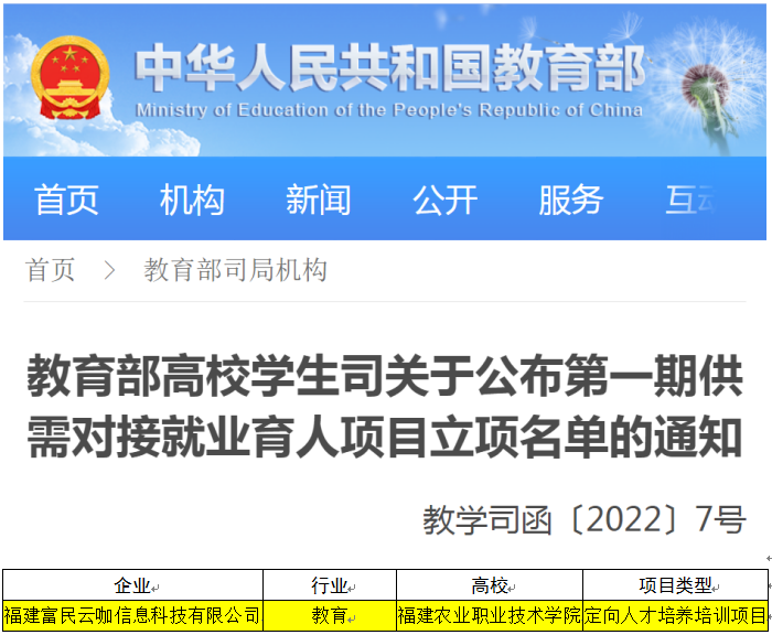 近日,《教育部高校学生司关于公布第一期供需对接就业育人项目立项名单的通知》(教学司函〔2022〕7号)公布,永利官网与福建富民云咖信息科技有限公司申报的定向人才培养培训项目入围第一期供需对接就业育人项目立项。