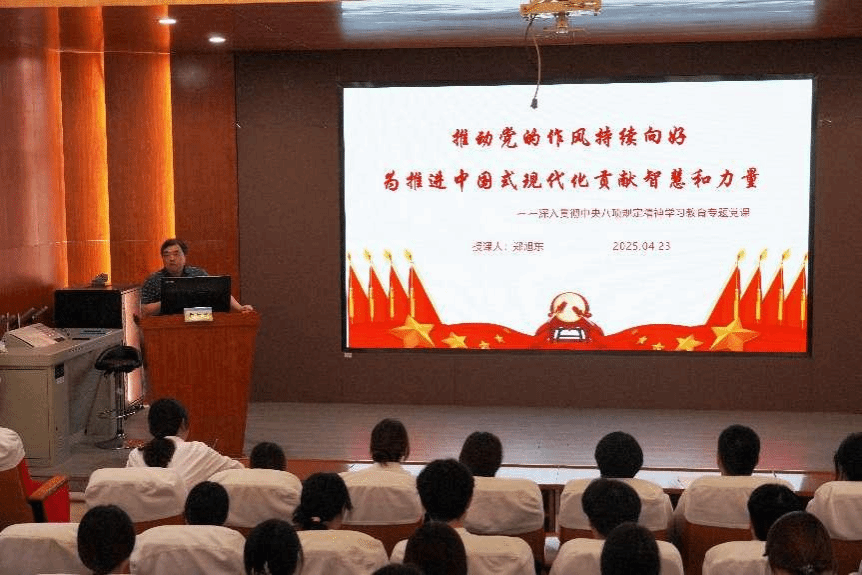 2025年4月23日上午,经济管理学院党总支书记郑旭东以“推动党的作风持续向好 为推进中国式现代化贡献智慧和力量”为主题,为学院第三期“青马工程”暨第七期入党积极分子培训班学员带来了一场深入贯彻中央八项规定精神学习教育专题党课。