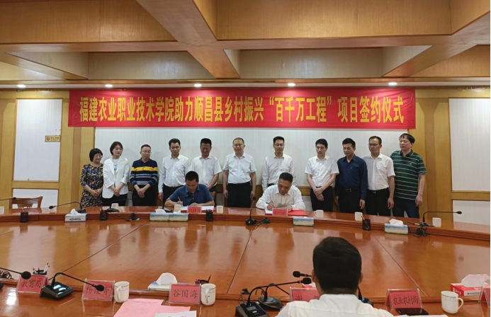 5月20日,我校助力顺昌县乡村振兴“百千万工程”项目签约仪式在顺昌县政府举行。校党委书记杨振坦、副校长严挺文、顺昌县委副书记、县长谷国海、县委副书记杨俊青、副县长谢辉,以及县教育局、农业农村局、埔上镇等单位代表出席了签约仪式。