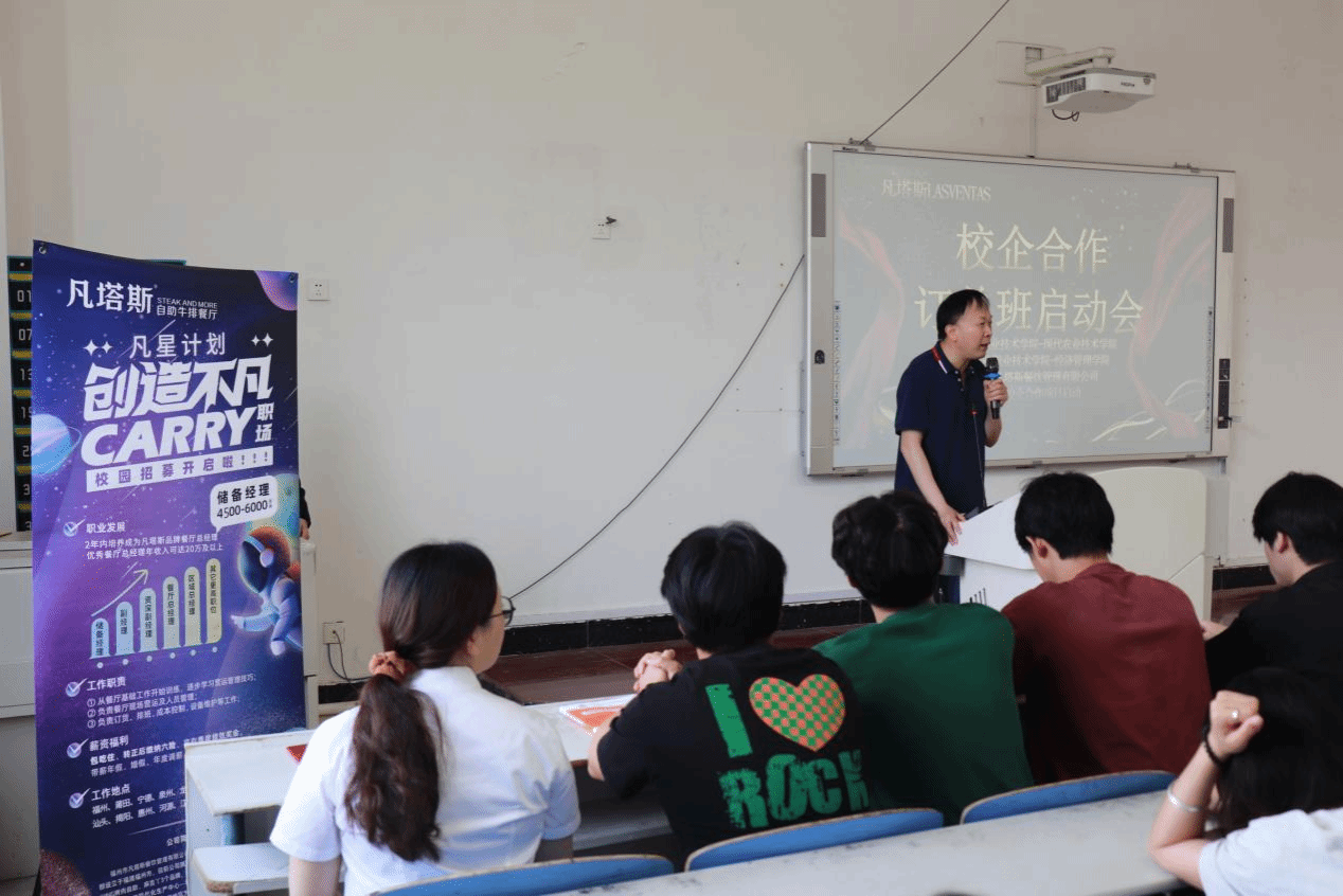 启动会由凡塔斯人力资源部经理蒋静宜主持,运营部区总李海平、现代农业技术学院冯冬林副院长、经济管理学院马风棋副院长先后致辞,拉开了本次启动会的序幕。凡塔斯企业代表针对“凡塔斯订单班”的培养模式,从“新员工入职简介”展开介绍,并发布端午节策划大赛,以此打响实战演练的第一枪。最后,预告后续线上面试安排,会上的互动答疑,会后的指导面试,这些都有效增进了学生对企业及未来职业发展的理解与期待。