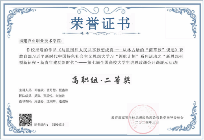 近日,教育部主办习近平新时代中国特色社会主义思想大学习“领航计划”之“新思想引领新征程·新青年建功新时代”第七届全国高校大学生讲思政课公开课展示活动获奖名单公布,我校作品《与祖国和人民共享梦想成真——从林占熺的“菌草梦”谈起》荣获高职组二等奖。