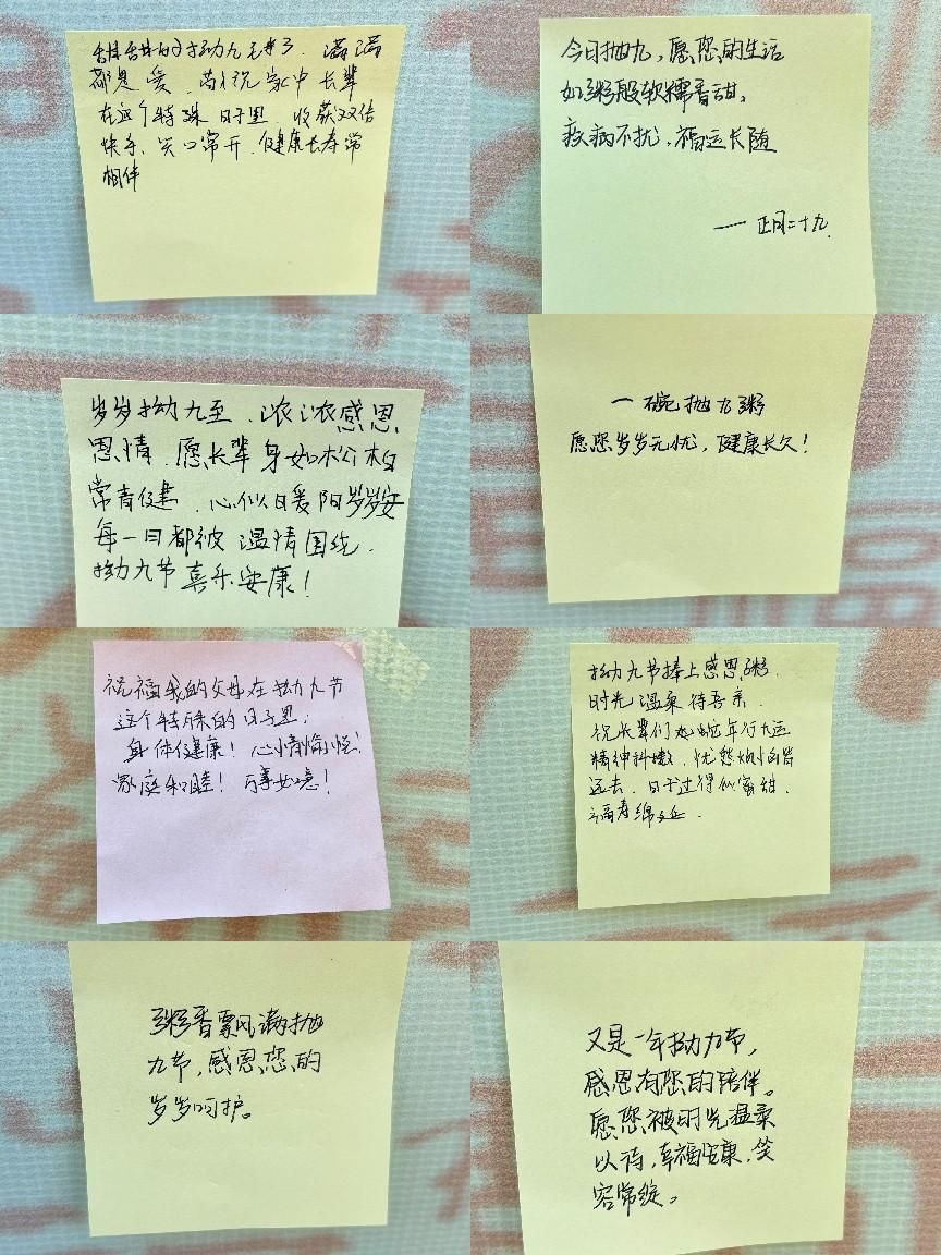 除了制作并传递拗九粥外,学生宿舍11号楼下还开展了“孝心卡”制作及感恩送祝福活动,老师及学生们纷纷在卡片上写下对父母、对长辈的祝福与感恩,并将孝心卡贴在心愿墙上。一张张卡片承载着同学们真挚的情感,表达了对长辈的敬爱与感激之情。
