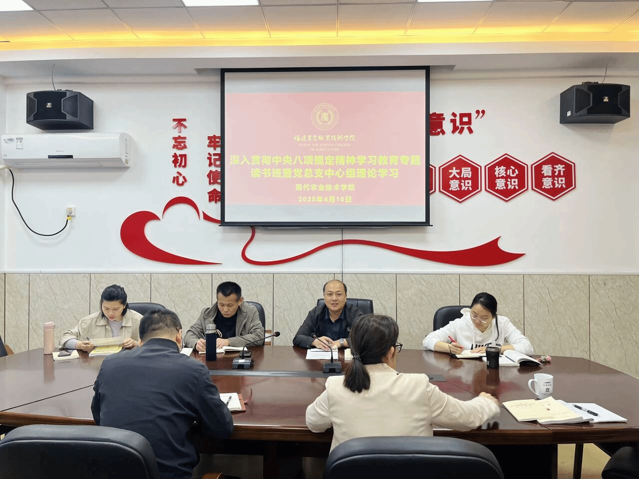 为深入学习贯彻中央八项规定精神,不断强化作风建设,4月10日上午,现代农业技术学院举办了深入贯彻中央八项规定精神学习教育专题读书班暨党总支中心组理论学习。会议由党总支书记欧高政同志主持,学院党总支委员参加了会议。