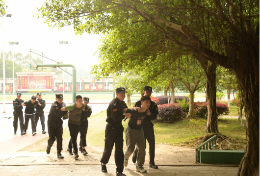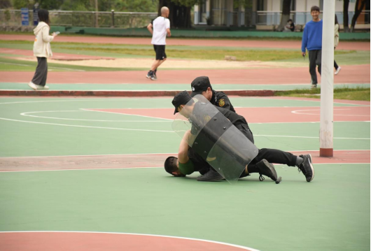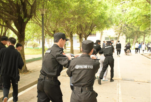 此次实战演练按照预案做了精心组织安排,成立了反恐防暴演练指挥小组,并由校保卫部门负责人对校卫队成员进行防暴设备使用及相关动作要领的培训指导。此次演练活动情景设定为六位同学在篮球场打球,因防守时发生肢体碰撞,双方产生了言语冲突并相互推攘,逐渐演变为打架斗殴,在场同学见状急忙上前拉架并报告辅导员,校园110在接到老师通知后,派出校卫队第一时间赶到现场,使用盾牌、钢叉等防暴器械合力制服斗殴双方并迅速带走处理情况。整个实战演练部署严密,效果明显。