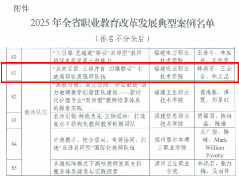 近日,福建省职业技术教育中心公布了2025年全省职业教育改革发展典型案例评选结果。由永利官网教师林燕芳作为负责人撰写的《“双向互促 三师并育 四维联动”打造高职农类强师队伍》案例成功入选。
