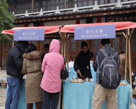 园艺园林学院的同学们分布在"非遗"吉市集与花市集,吉市集“茗茶有约”以闻香茉莉、寻味茉莉、宋韵点茶为主题,传承、创新、一盏茶的千年风雅气韵为载体,花市集“花开有声”以传统与现代元素交融碰撞,插花作品展览为主题,花艺表演、中国传统插花作品展览、现代花艺作品展览、游客手工花艺作品制作体验等为载体,为过往的游客行人带来精彩的茶艺表演和精湛的花卉工艺。