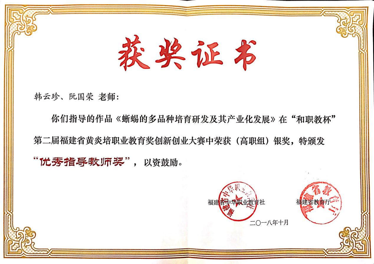 5.2018年10月,福建省黄炎培职业教育奖创新创业大赛“优秀指导教师奖”,省中华职业教育社、省教育厅;